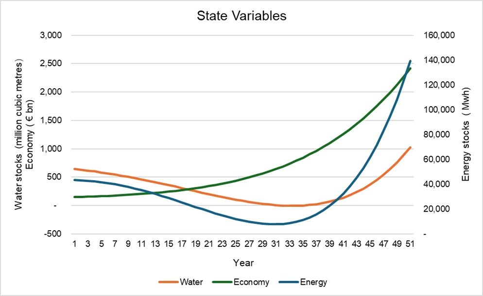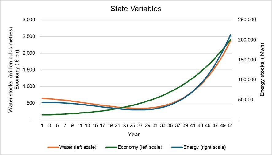 In this simulation, a time period of 50 years is considered (T = 50). The development of the three state variables for energy, water and economic capital are presented in Figure 2 below.
